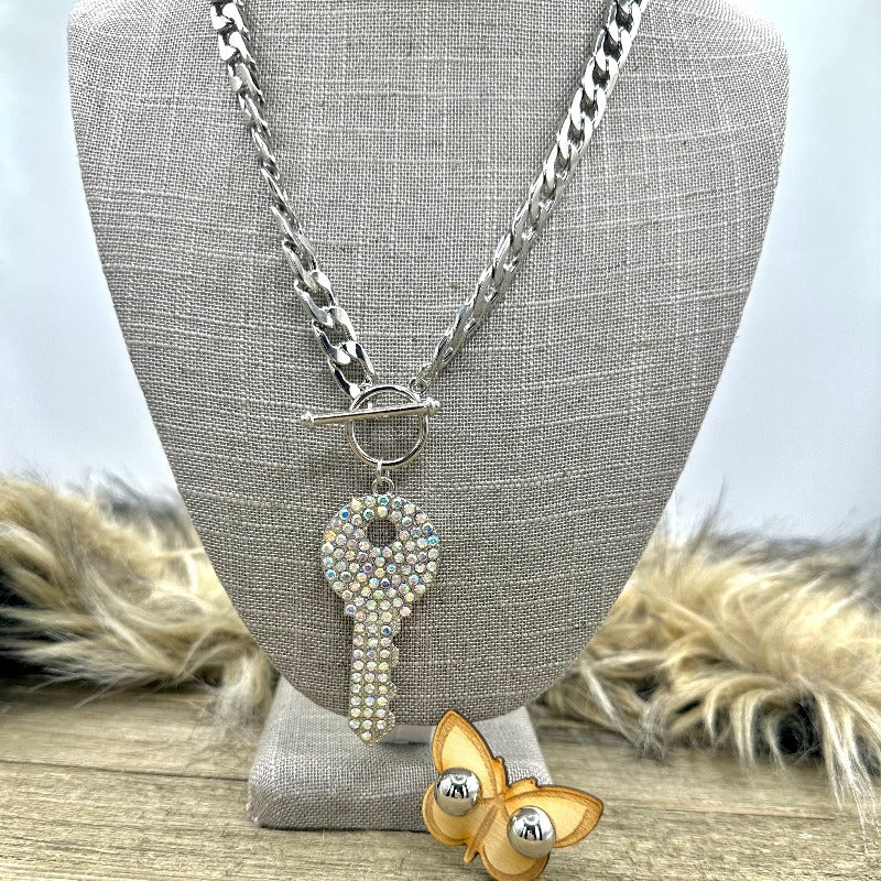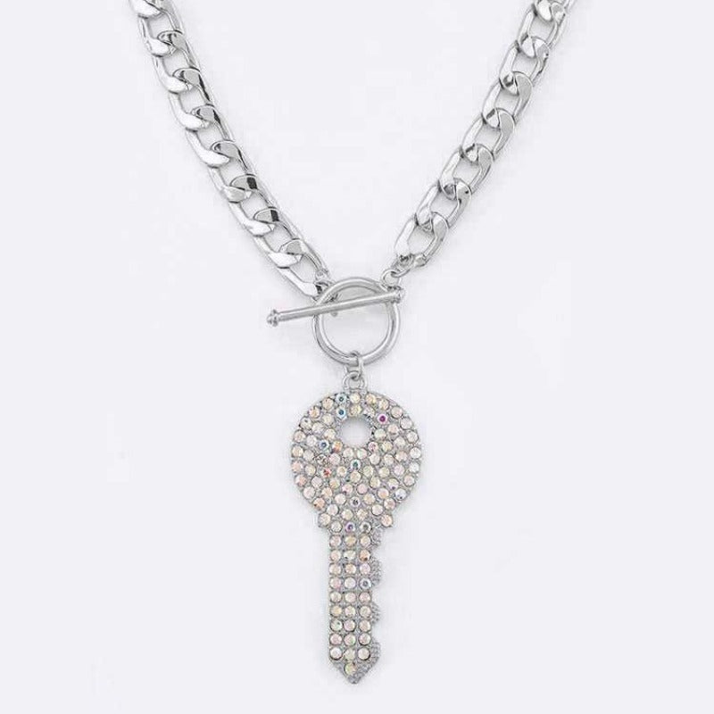Get ready to unlock your inner glamour with our Unlock the Glamour Key pendant necklace and ball stud earring set. This iridescent AB crystal-adorned key pendant adds a touch of edgy elegance to your style, making it the ultimate hip accessory for fashion-forward individuals. Make a statement and unlock the door to your unique fashion journey with this trendy necklace. Reverse the Key & wear it for a different look!