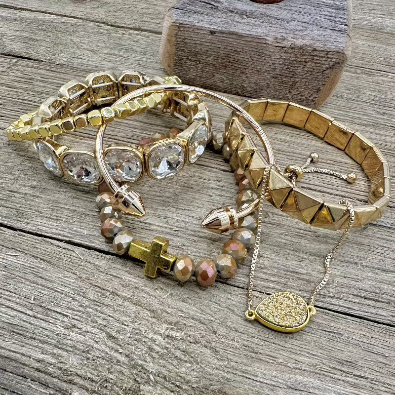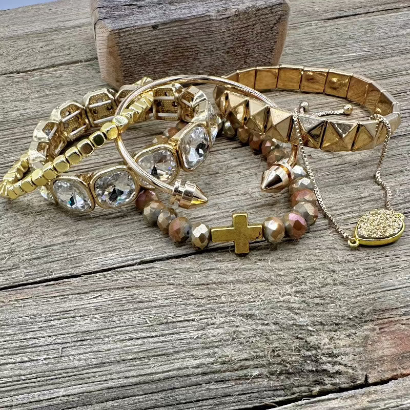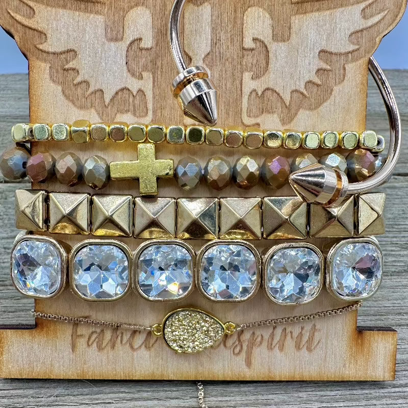 Where the dazzle of gold meets an edgy rebellion of boho sass. A perfect combo of style and shimmer. Treat yourself with the Golden Glitz Rebel Stack and unleash a rebellion of glimmer and boldness. Each bracelet is a spark of sass, a golden flash that defies the ordinary. Strut on the edge of glamour, darling, because with this stack, you're not just accessorizing – you're leading the charge of a Golden Glitz Rebel. 💫🔥✨ #GoldenGlitzRebellionStack #SassyEdgyGlam