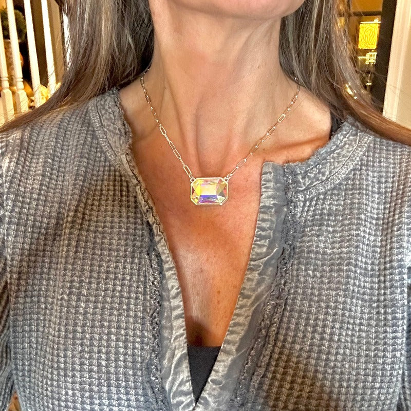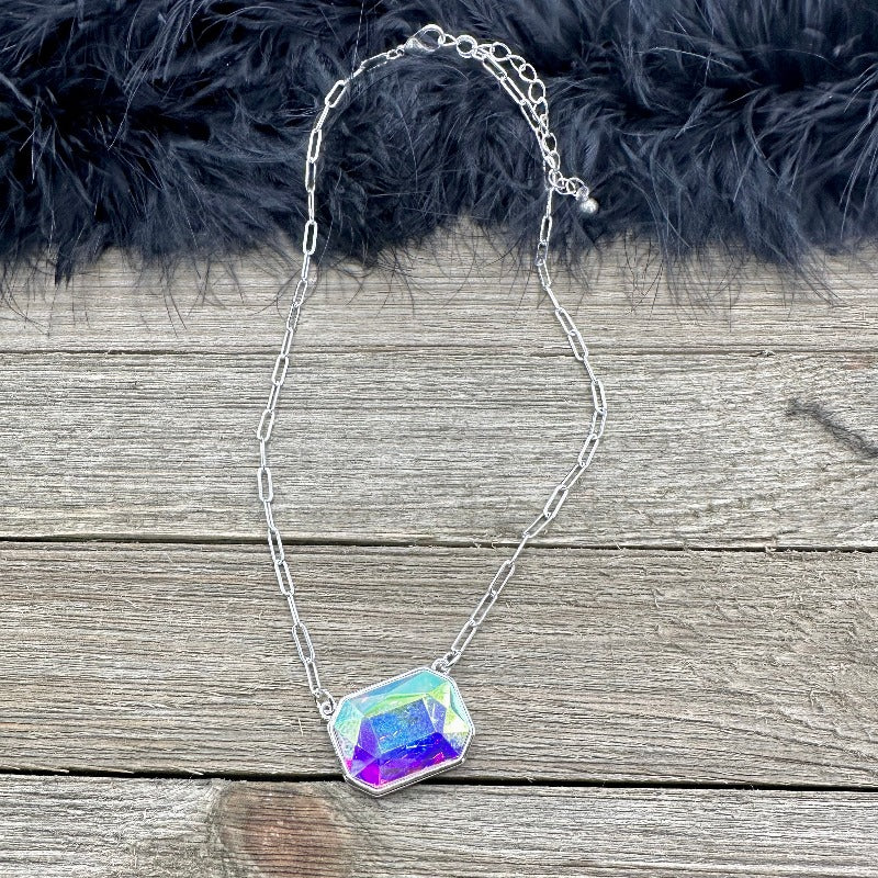 Unleash edgy boho chic with our Iridescent Crystal Paperclip Chain Necklace. Perfect for layering with your favorite necklaces, it adds a daring touch to your unique style. Make a statement, break boundaries, and elevate your look with this captivating piece that's as individual as you are. Wear it solo or as a layering piece with your silver toned chains to make it a bold look!