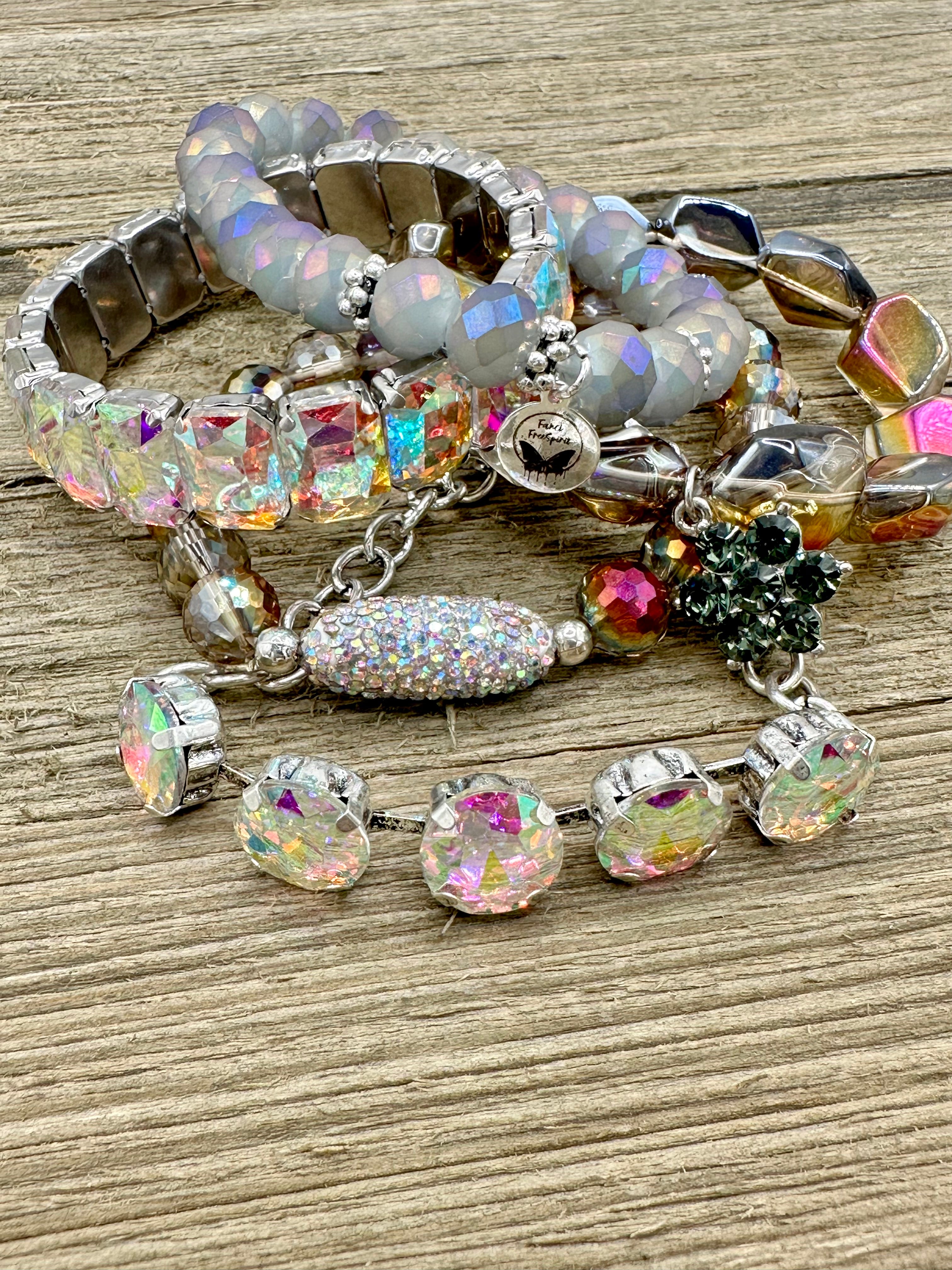The Luminosity Stack is perfect for making a statement. With unique and eye catching stones, fun textures and iridescent crystals, it's the ideal bracelet stack to add a flair to any outfit. It features five unique bracelets, designed to layer tastefully together. Wear altogether or 3 on one side with 2 on the other with your favorite watch for the perfect arm party!