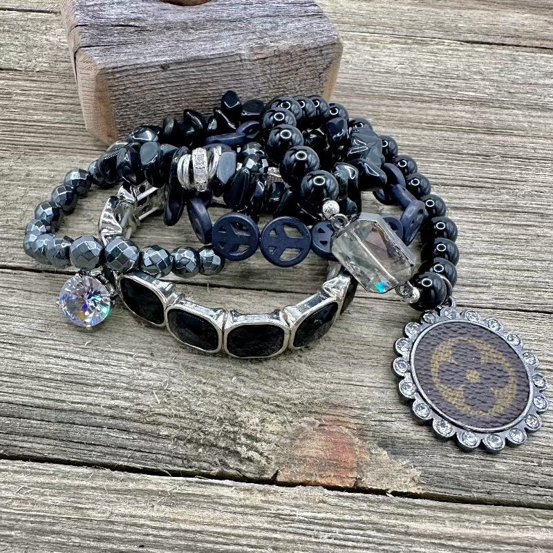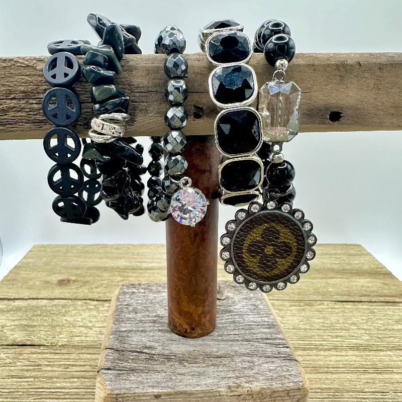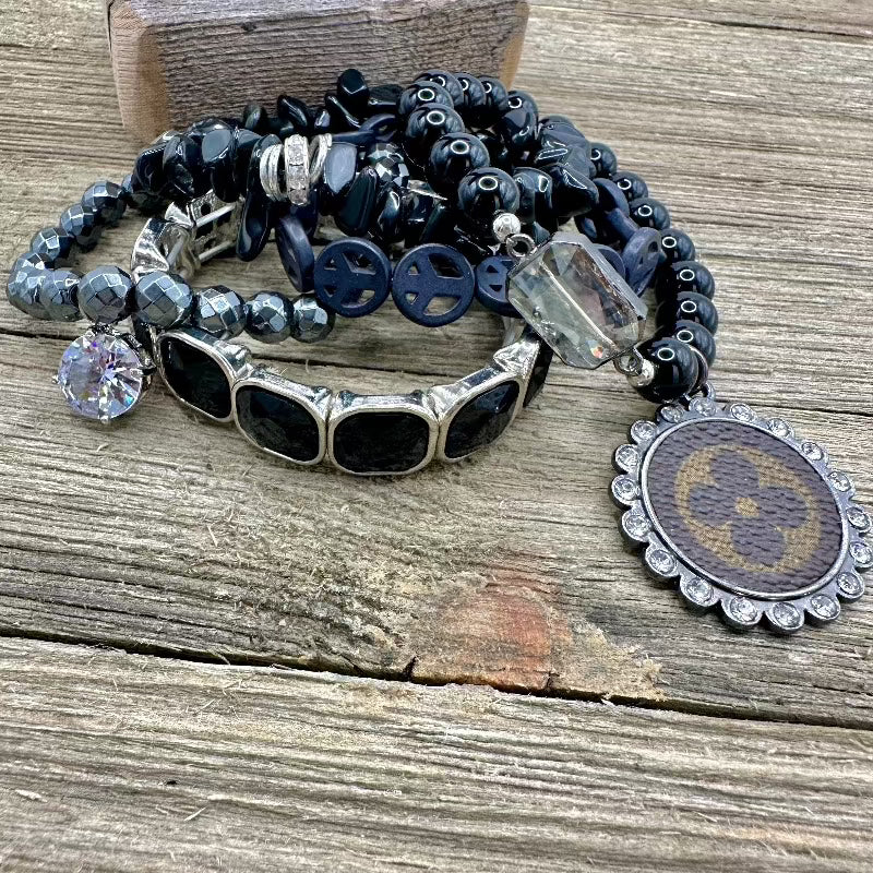Step into the spotlight with our 'Noir Peace Parade' LV Luxe Designer Bracelet Stack – where bold attitude meets timeless elegance! This stack is a sassy celebration of sophistication in shades of midnight black, infused with the rebellious charm of peace signs.